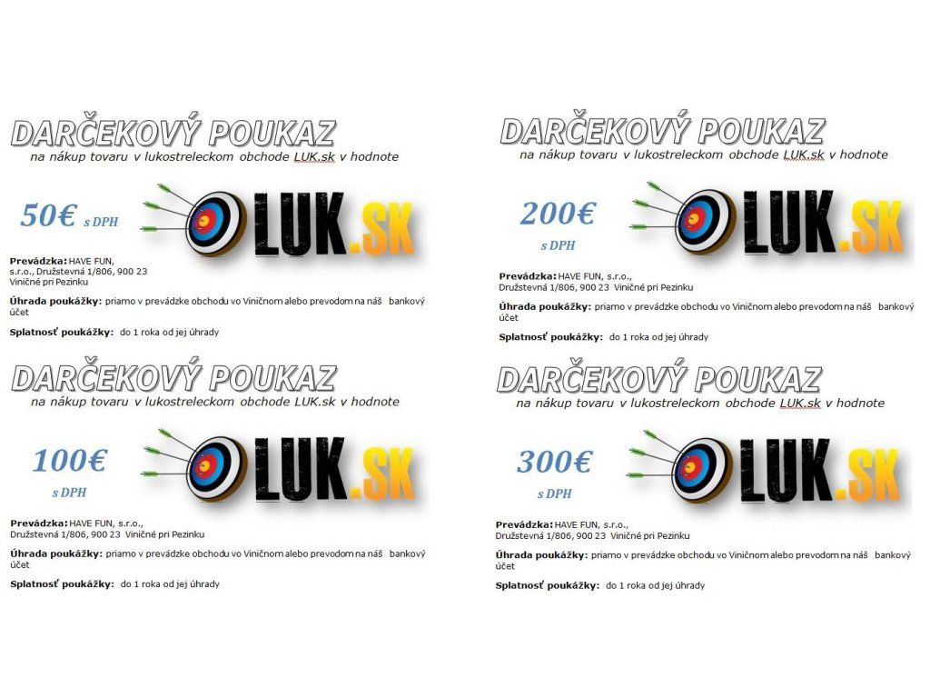 V prípade, že chcete potešiť svojho známeho darčekom z lukostreľby a neviete presne čo by sa mu páčilo alebo bolo vhodné, dávame Vám možnosť kúpiť si darčekovú poukážku na nákup tovaru v hodnotách 50, 100, 200, 300 a 500 Eur (vrátane DPH) a tak si obdarovaný môže sám vybrať čo sa mu najviac páči. Poukážku Vám vystavíme podľa Vášho želania na uvedenej hodnoty. Platná je od okamihu úhrady v hotovosti priamo u nás v obchode alebo v deň pripísania sumy na náš bankový účet a je platná 1 rok od úhrady. Je možné ju použiť ako kredit na zakúpenie akéhokoľvek tovaru z lukostreleckého obchodu LUK.sk a KUSA.sk. (HAVE FUN s.r.o.) okrem darčekových poukazov. V prípade objednania darčekovej poukážky uveďte prosím na záver do poznámky o akú menovitú hodnotu poukážky máte záujem. Poukážky s Vami prekonzultujeme telefonicky alebo osobne.
