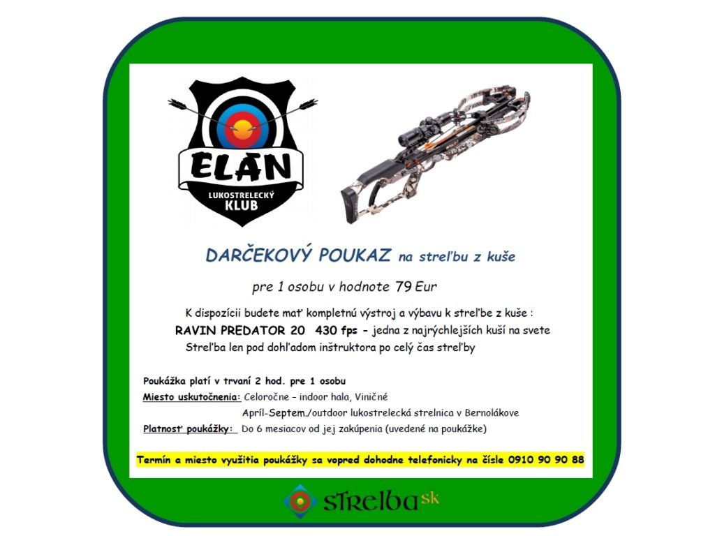 Darčekový poukaz na streľbu zo superkuše BARNET HYPERTAC 430 fps, ktorá má rýchlosť 400 fps (118 m/s), je veľmi presná, na 20 metrov dokážete strieľať do 1 centovej mince ! na 50 metrov do tenisovej loptičky. zahŕňa 2 hodinovú streľbu vrátane zaškoľovania (možné počas celého roka). Streľbe z kuše predchádza zaškolenie k manipulácii a obsluhe kuše abezpečnosti pri streľbe, inštruktor je prítomný po celý čas streľby.Strelec má k dispozícii kompletnú streleckú výbavu.