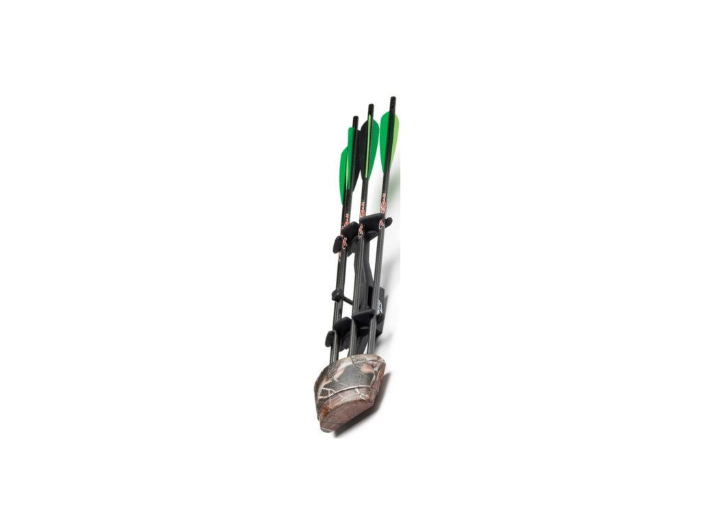 Excalibur je jednoduchý a praktický plastový držiak na kuše (na 4 šípy) v čiernej alebo CAMO farbe na rychloupinák, ktorý sa dá ľahko zložiť z kuše a späť.
