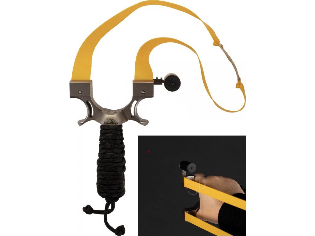 Oceľový masívny prak Blackbird Butterfly PRO L1 s rúčkou obalenou paracordovou šnúrou a mieridlom (2 druhy mieriaceho očka) a pridané laserové ukazovátko. Prak je z pevnej ocele na hobby streľbu oceľovými alebo hlinenými guličkami. Munícia pre prak je skladom. (oceľové, hlinené, paintballové alebo porcelánové guličky rôznych rozmerov)