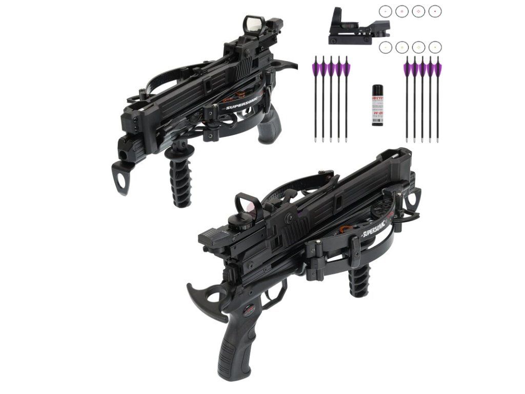 Veľmi rýchla a pritom malá kuša Supersonic REV Tactical so zásobníkom určený na športovú streľbu či obranu s efektívnym využitím napínacej sily a až 340 fps rýchlosť šípu (pri šípoch tactical 135gn). Napína sa pomocou tiahla vzadu, dospelý človek ju rukou jednoducho natiahne. Súčasťou je nastaviteľný kolimátor so 4 možnosťami zámerných krížov v dvoch farbách zelenej a červenej, vosk a predná sklopná rúčka a 10 karbónových šípov. Efektívny dostrel cca do 30-50 metrov.
