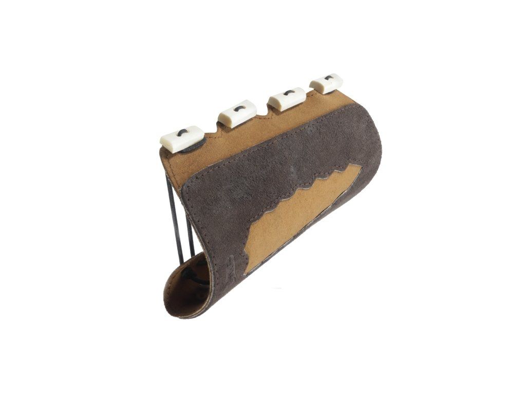 Súčasťou koženého tradičného chrániča sú 4 úchyty z kosti, ktoré pomáhajú chránič upevniť na ruku pomocou šnúrok. Krásny hnedý chránič na na pažu na tradičnú lukostreľbu, hodí sa k longbow alebo inštinktívnemu typu luku. Značka el TORO.