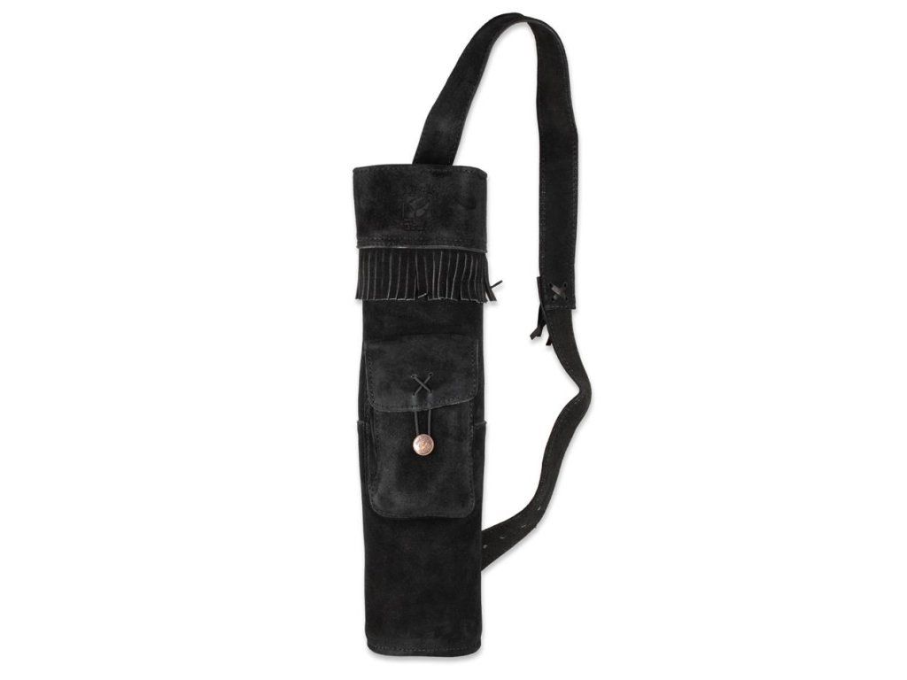 Buck Trail BAYOU back quiver featuring a single-strap design, crafted from black full-grain leather. It includes a small side pocket for accessories.