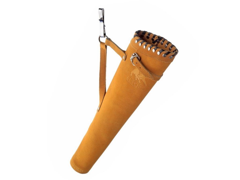 Kožený tulec na šípz ako konusové puzdro s prešívkou z kože na zavesenie na bok na pracku.