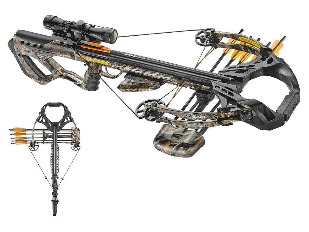 The Superfast Mechanical Crossbow EK Poelang Guillotine X 400 fps is equipped with 4 carbon arrows, 4x32 scope, rubberized grip, and a quiver holder and integrated safety mechanism to prevent accidental discharge without an arrow. This is a very accurate crossbow, the material base is of high quality, and the accuracy at 50m is approximately 7cm with arrows of the specified arrows. It is among the fastest crossbows available on the market in the 400 fps category up to 500 euros.