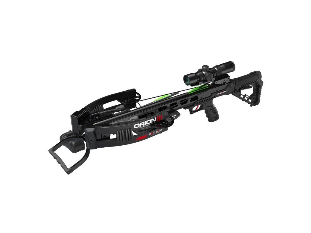 The HORI-ZONE ORION III is a high-performance compound crossbow designed for both hunting and precision target shooting. It features an adjustable telescopic stock and a customizable front grip. With its immense power, it is capable of ethical hunting or accurate target shooting at distances up to 100 meters.