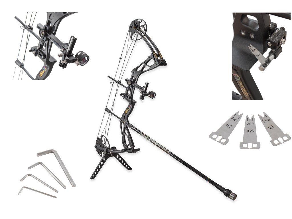 Equipment: target rest with fork base, target microadjustable sight, target long stabilizer and simple peep on the strings for aiming, wrist strap, stabilizer damper and lubricant for strings and key for bow screws. (Stand for bow and replacement fork base are not included in the equipment - fig. is illustrative.)