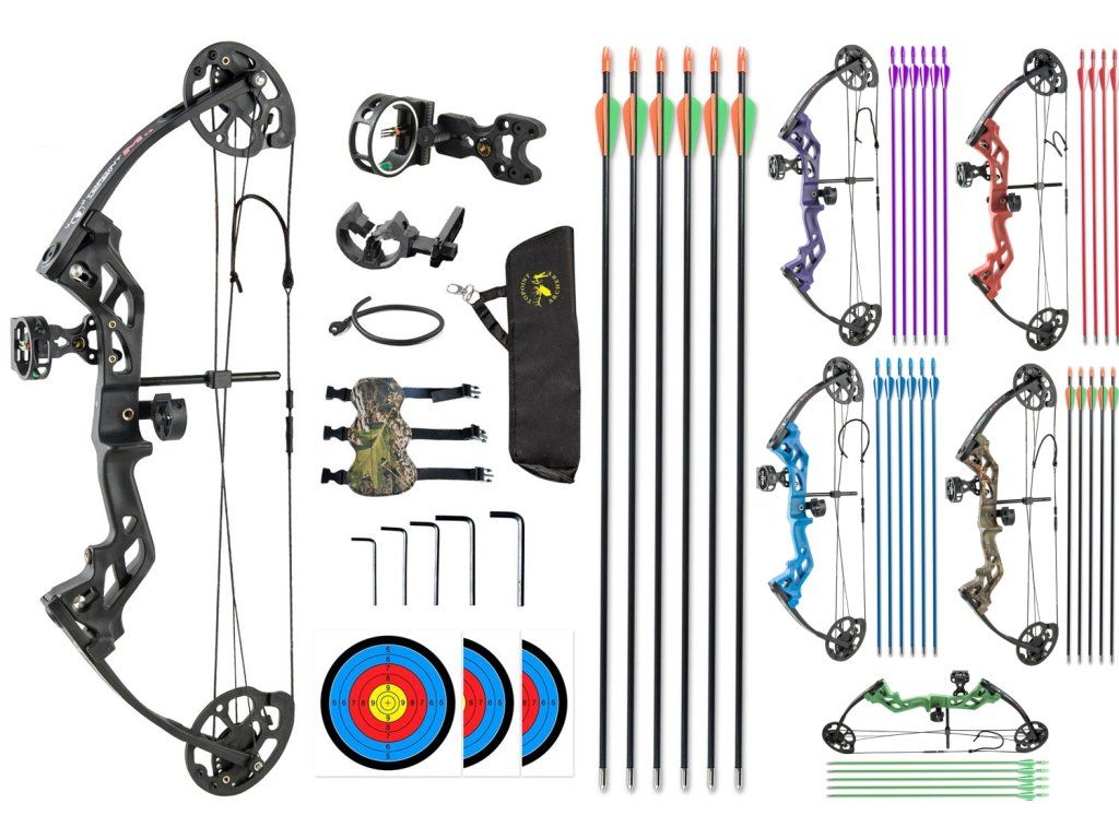 Kladkový luk pre deti TOPOINT M3 10-30 lbs v sete na rekreačnú streľbu a začiatky streľby v útlom veku detí, pomerne kvalitne spravený detský kladkový luk na presné strieľanie. TOPOINT M3 package obsahuje ako na obrázku základku 3 pinový zameriavač, peep, tulec a chránič na pažu s kľúčami na nastavenie a farebné terče, plus šípy vo farbe luku v počte 6 ks.
