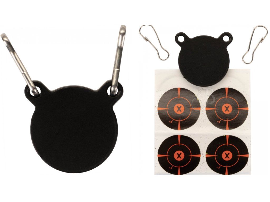 Metal target for the Blackbird mini target with multiple paper adhesive targets and carabiners for hanging.