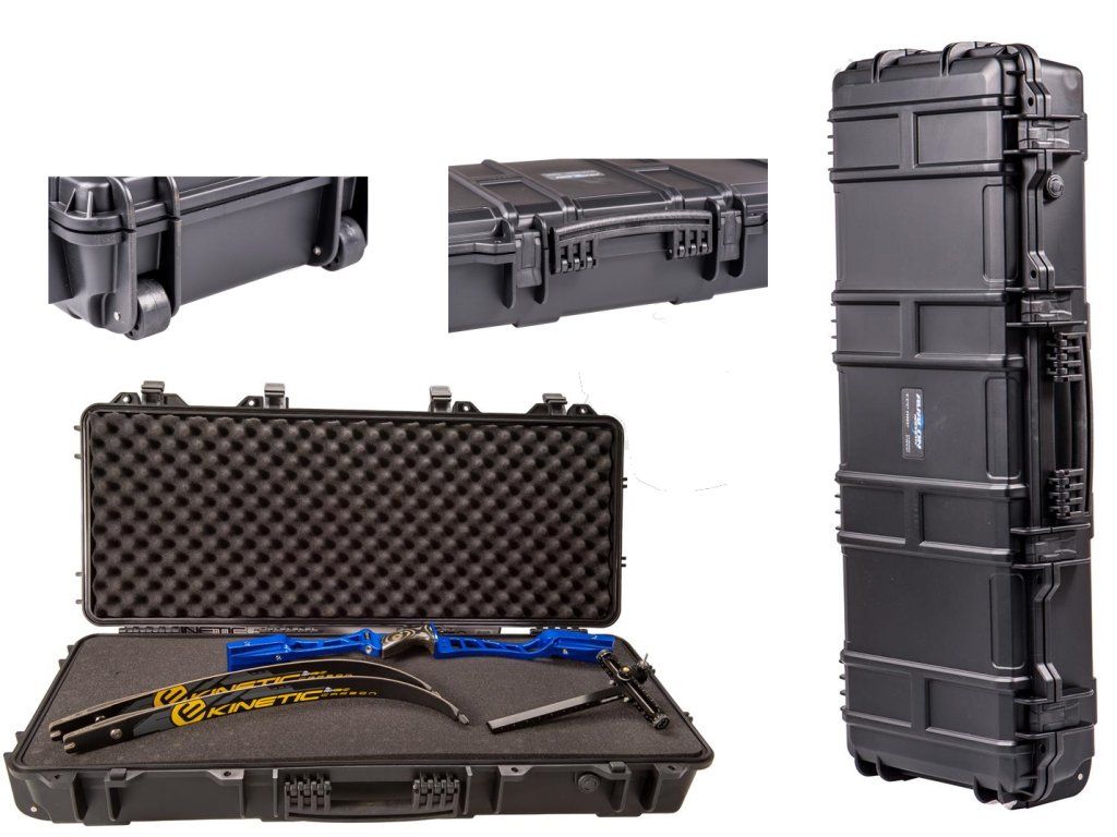 Robust polyurethane hard-shell suitcase for the Avalon Hard case folding bow with a soft lining, simple clips for fastening, wheels to facilitate movement. Suitable for air travel or also for a pistol case. One of the sturdiest suitcases in its price range. There is also the option to lock with an external lock (lock is not included)