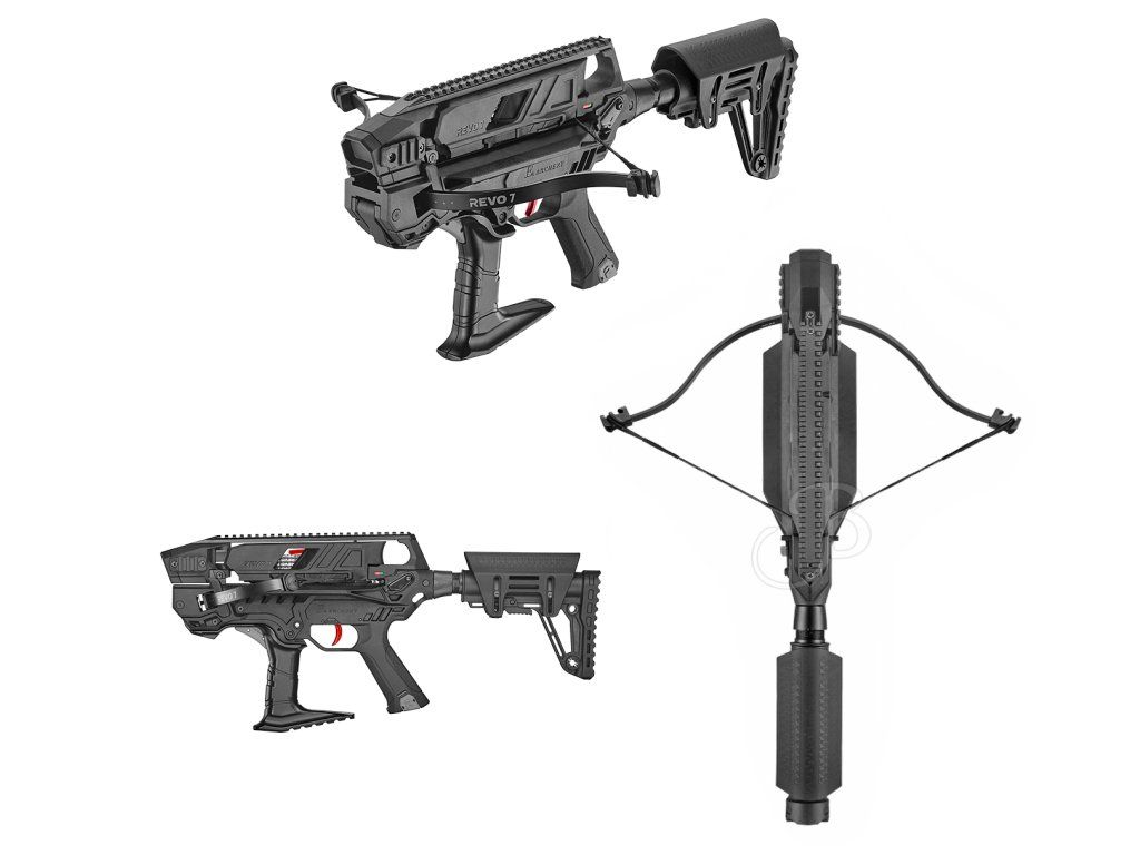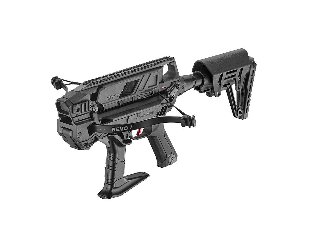 Kuša REVO 7 so zásobníkom na 7 šípok na streľbu do 30-40 metrov o sile 90 lbs, ktorá vyzerá veľmi takticky, má sklopnú rukoväť na napínanie tetivy, teleskopickú pažbu, lištu na montáž optiky ako je kolimátor, kušohľad alebo mechanické sklopné mieridlá. Kuša je vybavená s pištoľovou rukoväťou 7 šípkami.