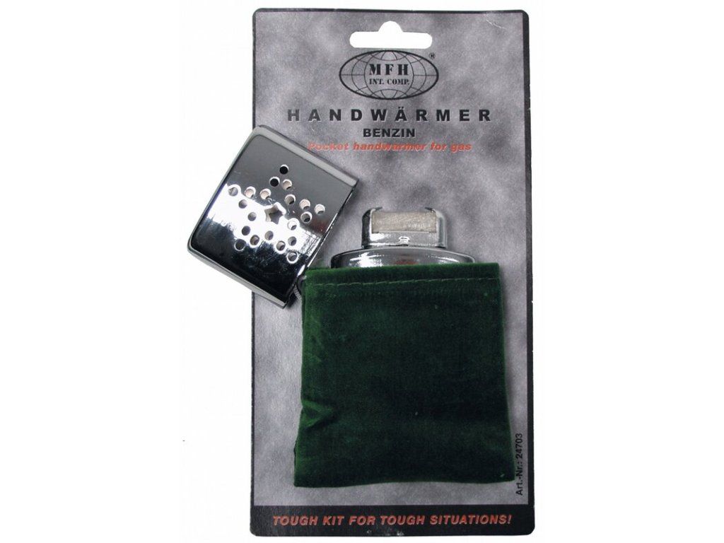MFH Benzínový zohrievač rúk, ktorý je zároveň zapaľovačom s nehorľavým púzdrom na zohriatie rúk v studených podmienkach, vhodný na rôzne outdoor a survival použitie.