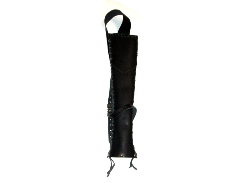Ručne vyrábaný krásny a štýlový pevný kožený deluxe tulec z kvalitnej kože na zavesenie na chrbát z hladkej hrubej kože celý z čiernej farby.