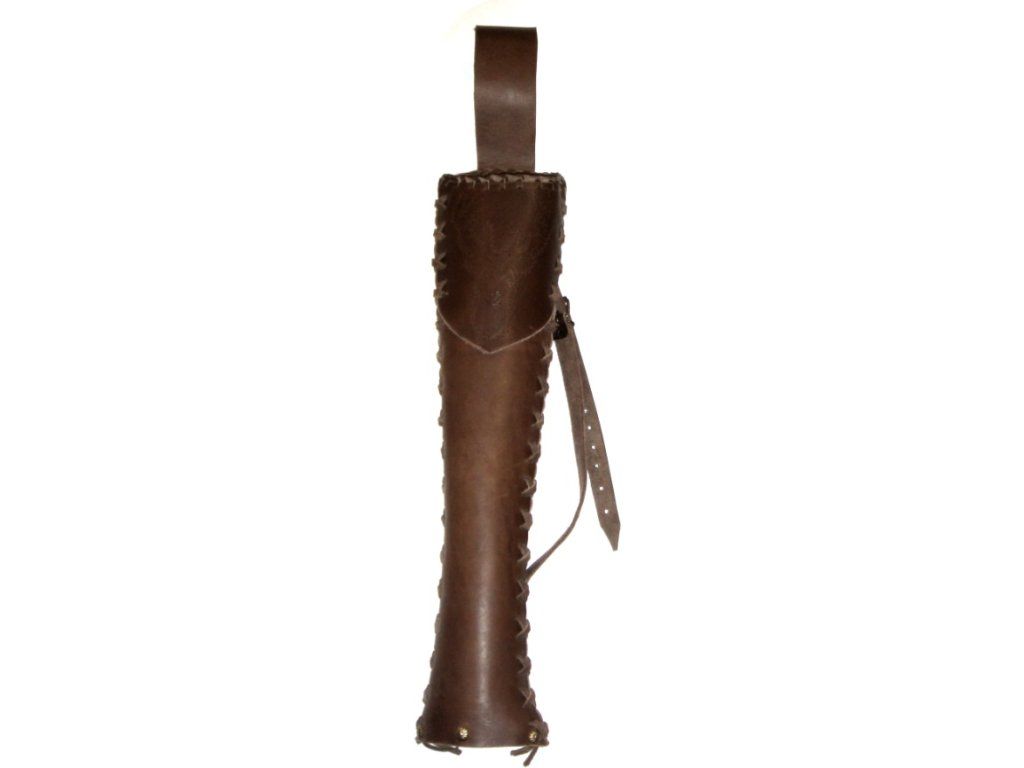 Ručne vyrábaný krásny a štýlový pevný kožený tulec z kvalitnej kože na zavesenie na chrbát z hladkej hrubej kože hnedej farby. Vzor jeleňa je ručne tepané (carved).