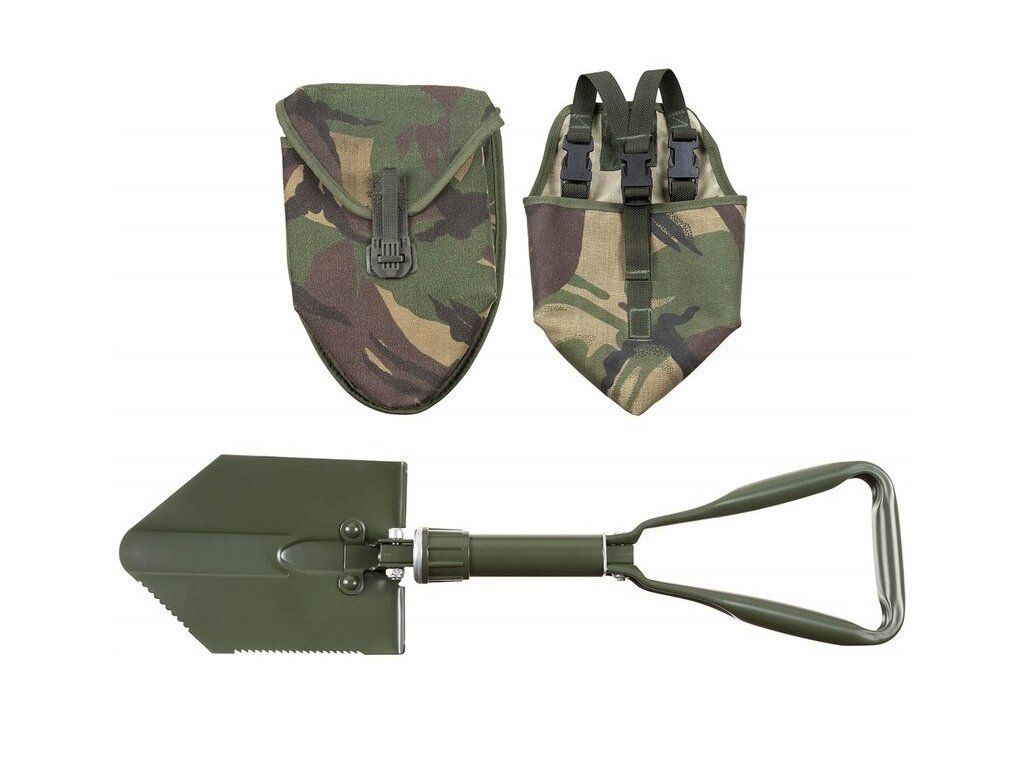 Folding shovel, 58 cm long, for outdoor use. Includes a carrying case that can be attached to a belt.