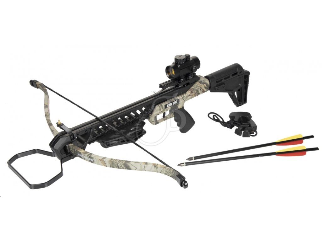 Included with the SKORPION XBR 300 is: 2 dural arrow shafts, a three-point collimator sight, bowstring tensioner, tactical front grip with a protective lip, pistol grip with adjustable stock, track lubricant. Effective range of approximately 30-40 meters, accuracy with a 6-10 cm spread is up to 25 meters with good arrows. Maximum range of approximately 250 meters. The mounting bracket is not part of the package.