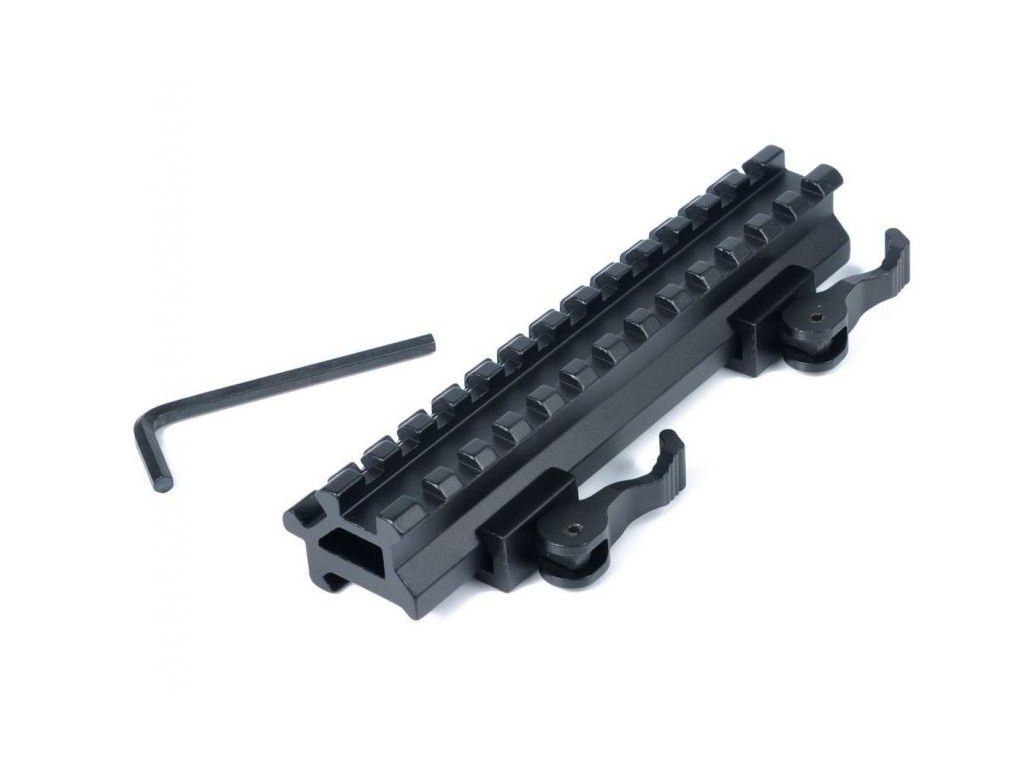 Rýchloupínacia weaver lišta spolu so 45° bočnou weaver lištou na montáž svetla / laseru alebo iného taktického doplnku.