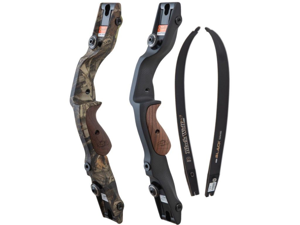 Elite carbon riser of a hunting bow from WNS Black Wolf for hunting use, competition to Hoyt Satori, HOYT Buffalo and HOYT Dorado risers as a riser for a short hunting bow with ILF limbs for carbon risers of various draw weights. Side adjustment and centering of the limbs possible. Handle made of dark wood. Available in black carbon and black camo. Previously under the WIN WIN Black Wolf brand, now WNS BLACK WOLF is for the most demanding hunters from a recurve bow, can also be used for 3D competition.
