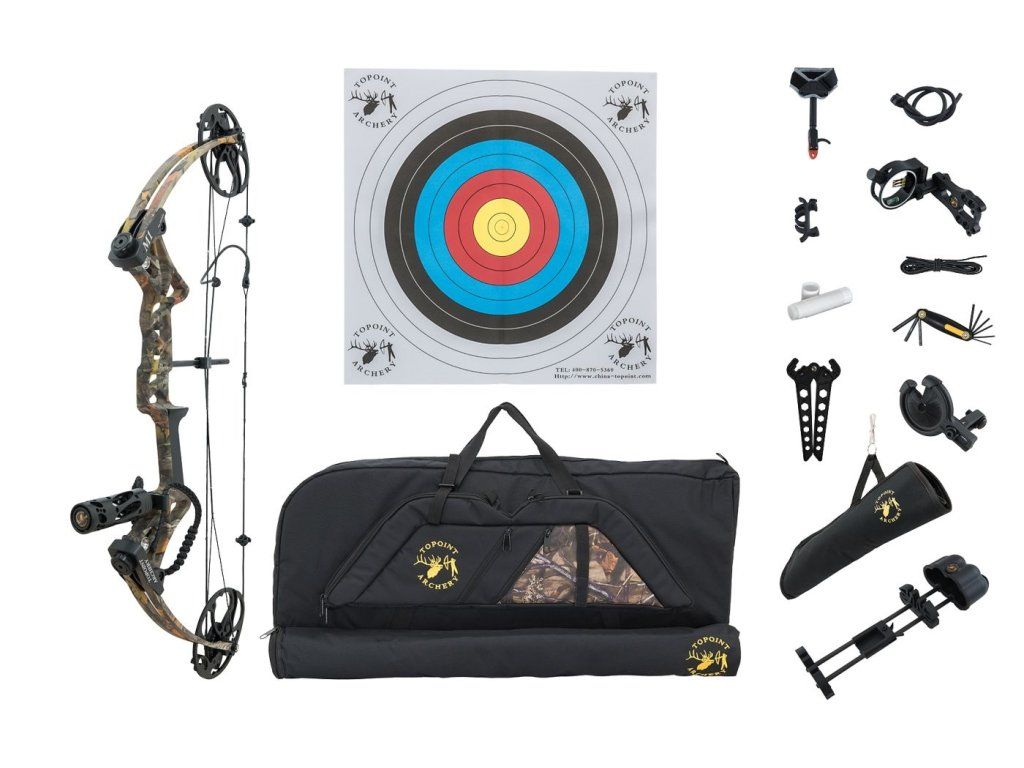Compound bow Topoint M1 deluxe camo 20-70 lbs set with bag, hunting quiver and bowstand