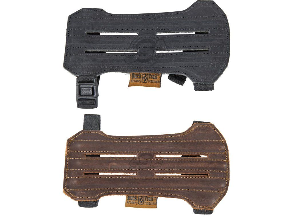 Traditional Buck trail Pecan 18 cm armguard with plastic clip and rubber straps. Well ventilated. Neat design of a functional armguard.