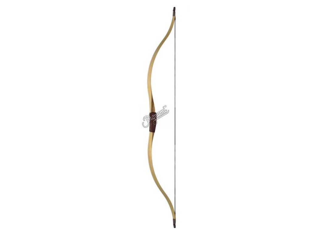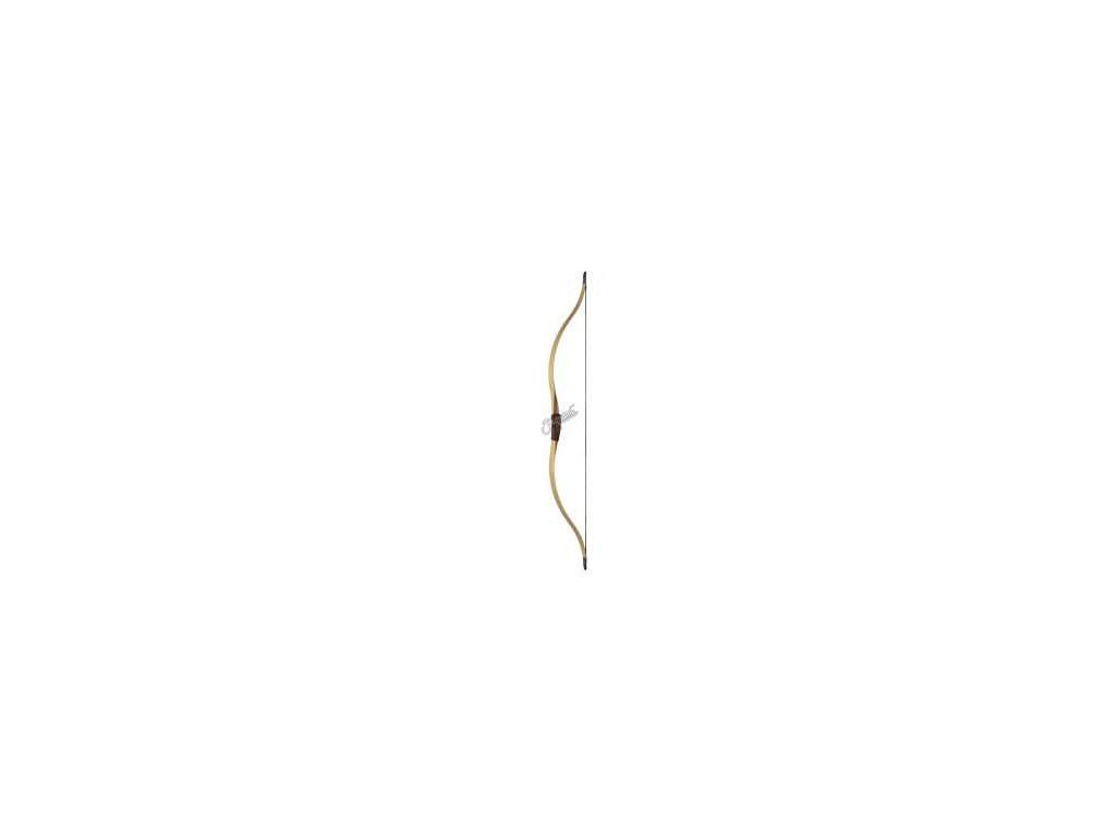 Lovecký krátky luk svetlej farby ramien z dreva a laminátu s výrezom na šípy na inštinktívnu streľbu alebo streľbu z koňa, prípadne aj lov. Cena je bez tetivy (3 Eur bežná dacron 12 čierna, 7 Eur dacron Big tradition 14 vlákien žlto-hnedá (odporúčané), 8,90 Flemisch dacron). Výrez na luku podstatne pomáha spresniť streľbu.