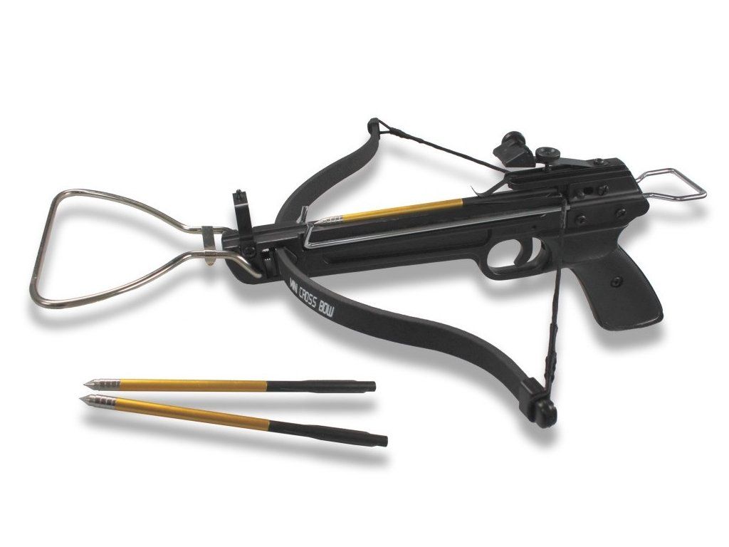 Súčasťou sú 3 šípky. Kuša má aj skladací nášľap o ktorý sa dá zaprieť a natiahnuť tak kušu. K dispozícii na sklade je náhradná tetiva aj plastové šípky na pištoľové kuše, duralplastové alebo duralové šípky a terčový záchytný materiál na túto pistolovu kusu v cene 24,90 Eur. (60x60x7 cm polyfoam). Toto nie je hračka, predaj je na občiansky preukaz.