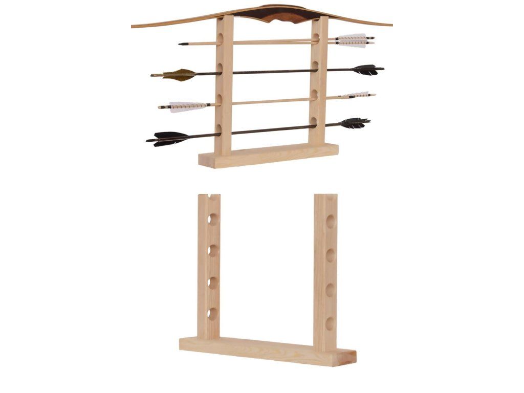 Drevený stojan na luk a šípy na dekoračné vystavenie na policu, regál alebo stôl. Zmestí sa doň niekoľko šípov a na vrch jeden luk.