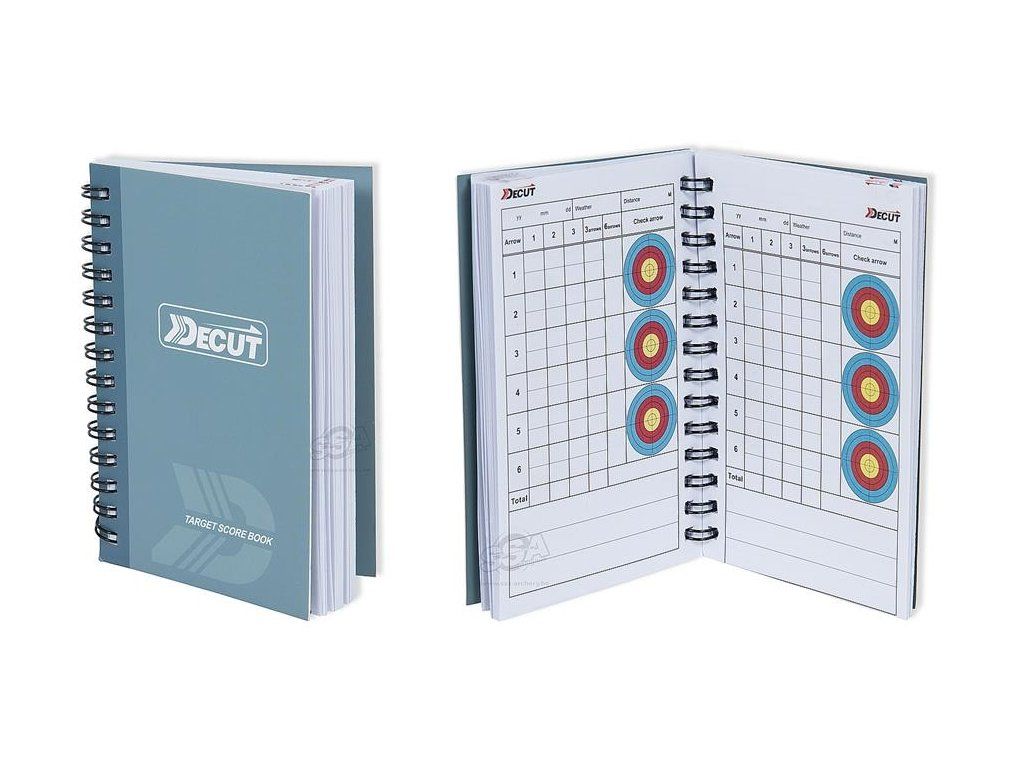 Zápisník a bodovacie tabuľky na tréning Decut score book. Predtým drahší Fivics score book bol skopírovaný týmto lacnejším zápisníkom decut. Vhodný pre súťažných strelcov, ktorí si zapisujú výsledky na tréningoch a súťaži. Súčasťou sú spotovacie terčíky na umiestňovanie pozície zásahov.